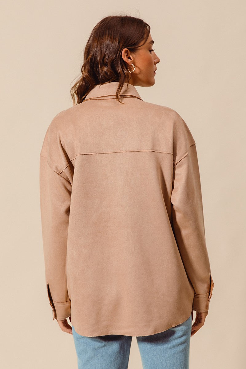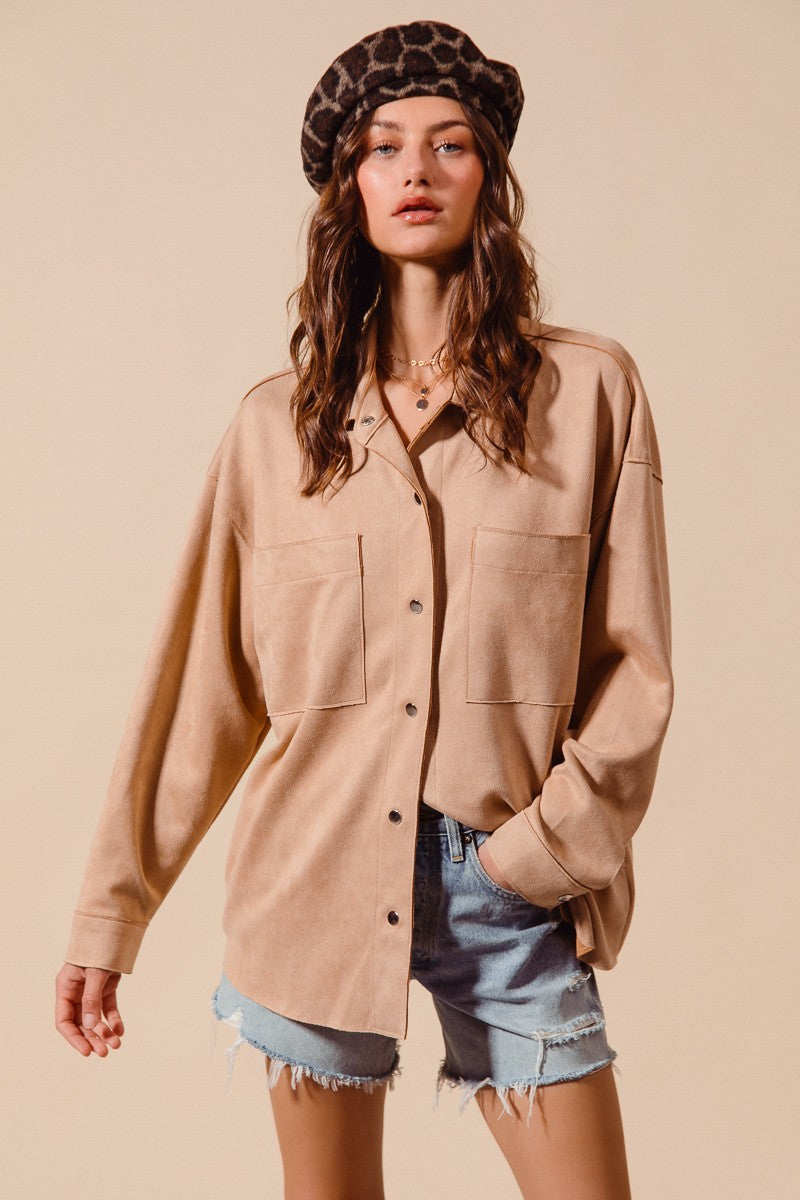 CAMEL FAUX SUEDE SNAP BUTTON SHACKET WITH COLLAR AND POCKETS