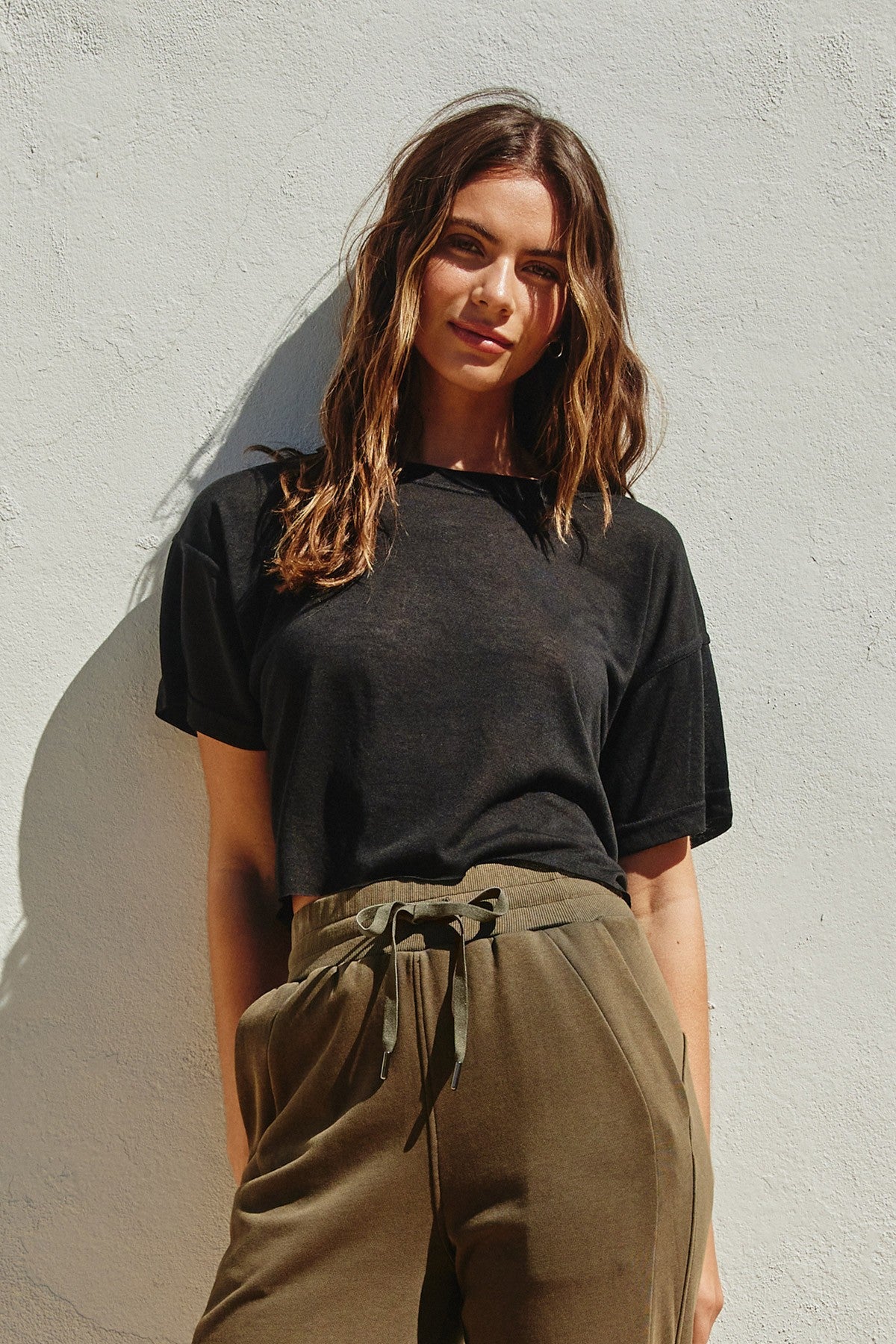 This short sleeve t-shirt is made with a thin breezy fabric cropped length with raw edged hem